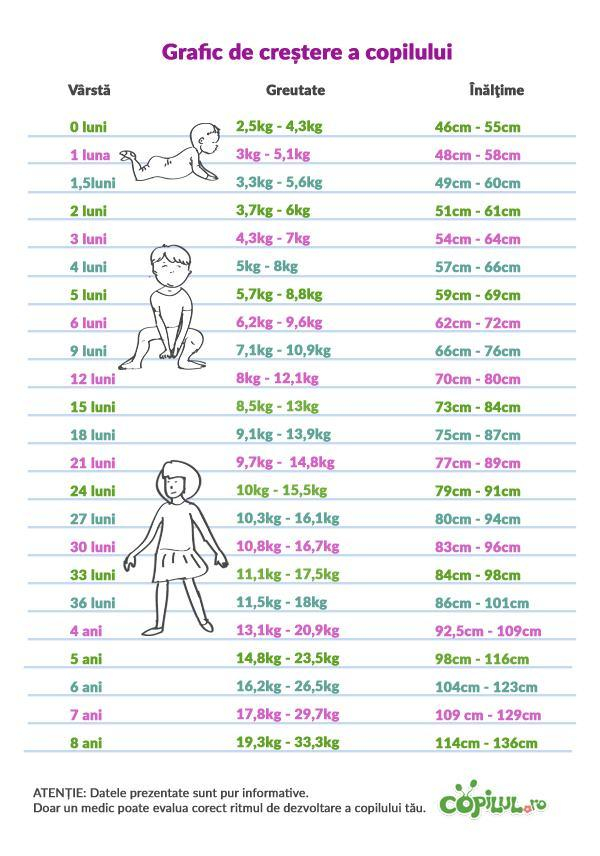 Consultă tabelul de mai jos pentru a vedea care sunt limitele considerate normale pentru greutatea și înălțimea copilului la diferite vârste.