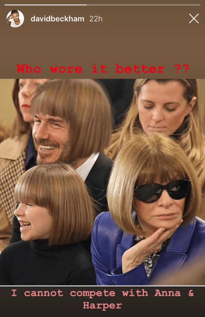 Până și David Beckham nu s-a putut abține să nu glumească pe seama asemănării dintre cele două și cea mai bună dovadă este fotografia pusă pe Instagram stories. Folosind Photoshop, David a realizat o imagine foarte amuzantă, în care și el are aceeași tunsoare bob precum Harper și Anna, explicând însă că nu poate să concureze cu cele două prezențe atât de stylish.
