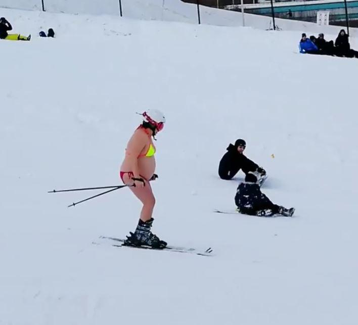 O femeie însărcinată în ultimul trimestru de sarcină schiază în costum de baie. Imaginile ieșite din comun au fost surprinse de locuitorii din Novosibirsk.